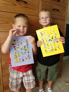 I cannot make this new editor behave, so I guess the text will be here. The top pic is Luke and Seth with their summer charts. We set some goals and made a list of lots of things to do this summer and did most of them. They earned stickers for days when they did their "homework" and chores without complaining. A few days ago they went and spent their loot. Luke chose a "How to Train Your Dragon" weapon set which is so him. He loves to dress up and pretend to be a cowboy, explorer, superhero...he was so disappointed though that the helmet didn't fit. It was perfectly round and not even close to big enough for his big noggin. Bummer! Seth picked a big robot that makes lots of noise. Yippee!